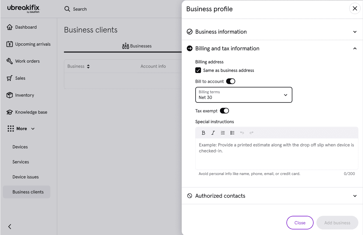 Asurion stores build long-term relationships with local businesses through a B2B repair model. These clients often drop off multiple devices at once, receive negotiated pricing or flat-rate discounts, and are billed periodically instead of paying at pickup.